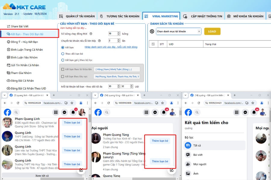 - Tính Năng Nổi Bật “MKT Care” là phần mềm kết bạn tự động được thiết kế để giúp người dùng tiết kiệm thời gian và tối ưu hóa quy trình tìm kiếm bạn bè trên Facebook. Phần mềm cho phép bạn tự động gửi lời mời kết bạn và quản lý danh sách bạn bè một cách hiệu quả.